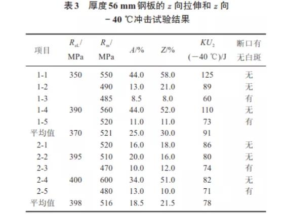 對(duì)鋼板進(jìn)行Z向拉伸和Z向-40℃沖擊試驗(yàn),試驗(yàn)結(jié)果如表3,Z向拉伸斷口有白斑的試樣強(qiáng)度指標(biāo)稍有下降,而塑性和沖擊韌性指標(biāo)下降明顯。