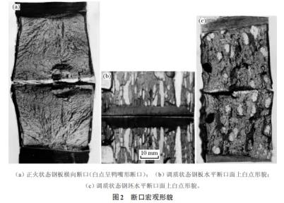 (1)鋼板拉伸試樣斷口面上白斑屬性為白點(diǎn)缺陷,這種白點(diǎn)缺陷是在鋼坯中形成的,軋制鋼板時(shí)沒(méi)有焊合而導(dǎo)致的二次白點(diǎn)。
