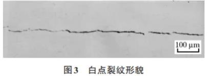 在低倍試樣確認(rèn)為白點(diǎn)裂紋處取金相試樣,有明顯的的鋸齒形特征,如圖3所示